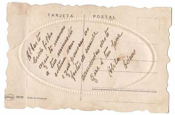 - Alberto, querido filho. Aqui te mando a tua noivasita (?) estima vem e que passem as festas de saúde. Saudades deste que é teu pae Abilio. Adeus.