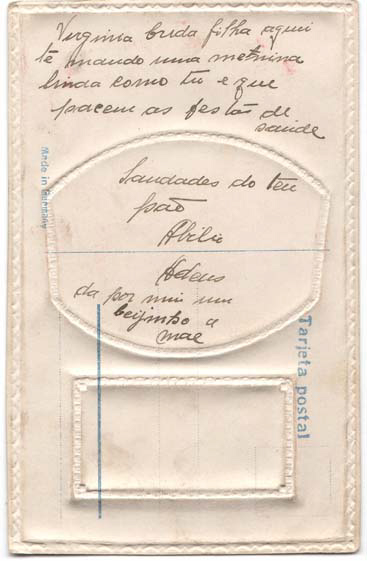 - Virginia, querida filha. Aqui te mando uma menina linda como tu e que passem as festas de saude. Saudades do teu pãe Abilio. Adeus. Da por mim um beijinho a mãe.