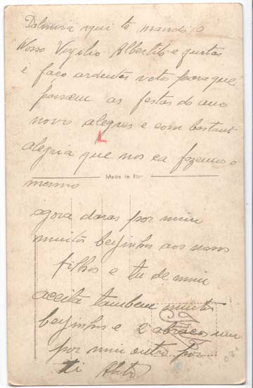 • Palmira. Aqui te mando o nosso Virgilio Albertito e gostas. E faço ardentes votos para que passem as festas de ano novo alegres e com bastante alegria que nos cá fazemos o mesmo. Agora daras por mim muitos beijinhos aos nossos filhos e tu de mim aceita também muitos beijinhos e abraços um por mim outro por ti. Abilio.