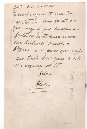 - Astra, 27-11-1934 Palmira. Aqui te mando a carta das boas festas e o que desejo é que passem as festas de Natal e ano novo com bastante saúde e alegria e é oara que vejas que tenho bom gostos e não me esqueço de ti. Adeus. Abilio
