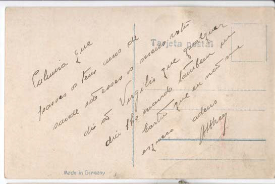 - Palmira. Que passes os teus anos de saúde são esses os meus votos. Di ao Virgilio que qualquer dia lhe mando também uma carta que eu não me esqueço. Adeus. A. Abreu.