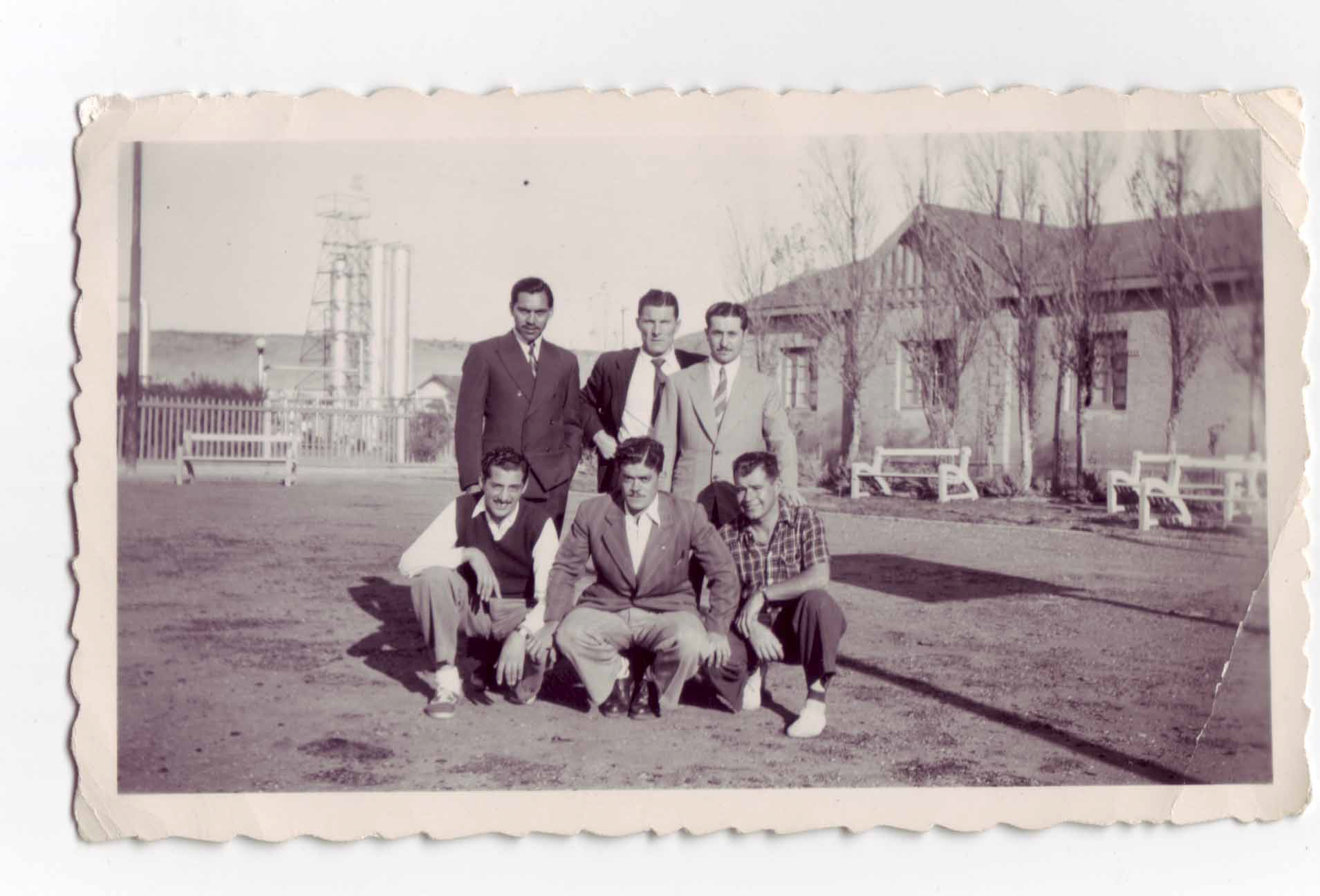 - Gas plant in background. Some people and Cipharelli front left, Racamato front center, Azcona (Proveduria employee) right rear, Gutierrez (""foguista"") right front.