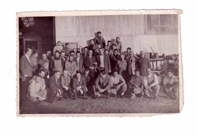 • Meeting of railroad workers unions La Fraternindad and Unión Ferroviaria in Km 5. Carlos Boyer is fifth from left, wearing overalls. Ca. 1952-53.