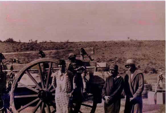- Carro patagonico y tres mujeres y un nino? Se pueden observar los detalles de la vestimenta. Detras un pozo de agua con rondano