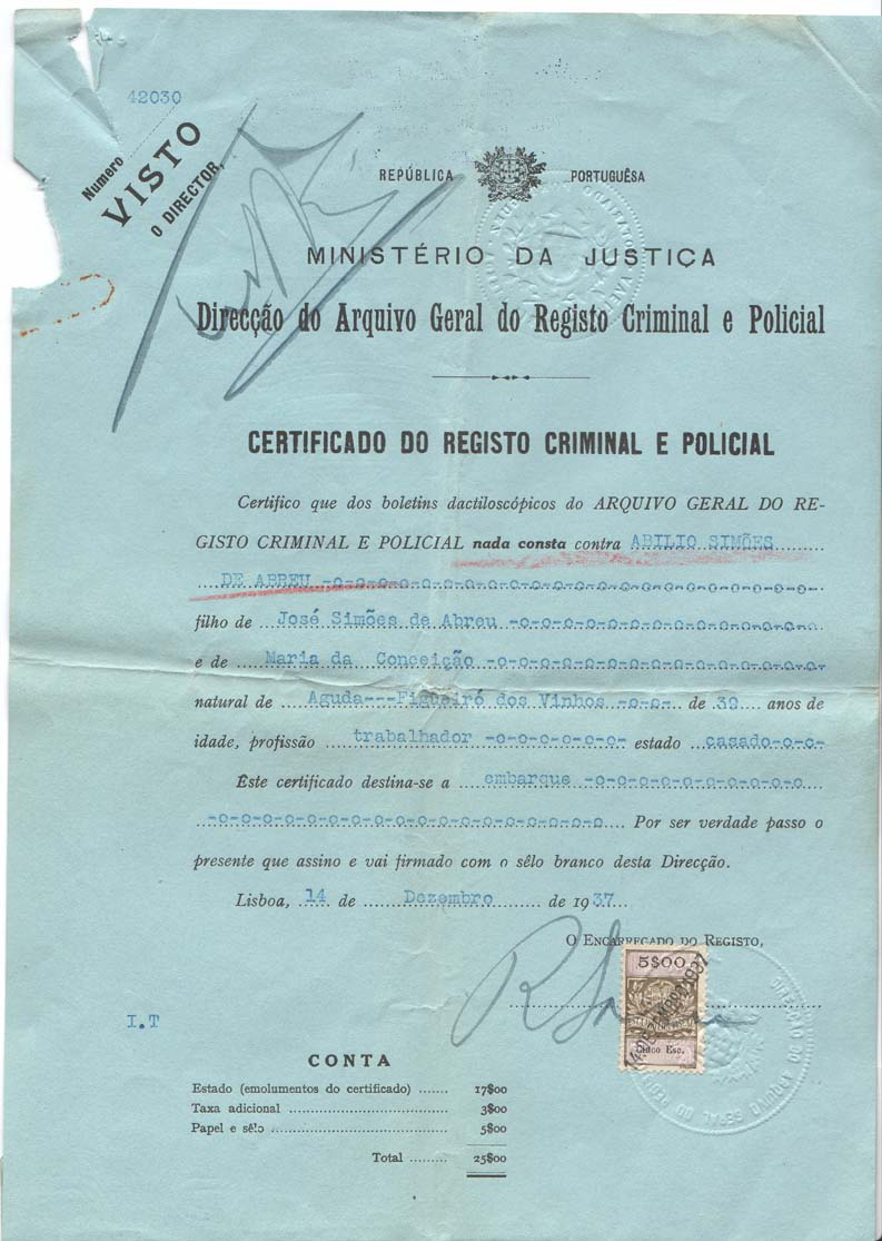 Portuguese Justice Ministry statement of good behavior for Abilio Abreu Image Information PAT00678 1937 Documents & Records; Migration Document 17 x 28 cm Abreu Spanish Image Information Certificado de buena conducta de Abilio Abreu emitido por el Ministerio de Justicia de Portugal Documentos; migración Post navigation back of consular registration with endorsementsreverse of above statement of good behavior Comment on this post Cancel replyYour email address will not be published. Required fields are marked *What is your message?Name * Email * Save my name, email, and website in this browser for the next time I comment.