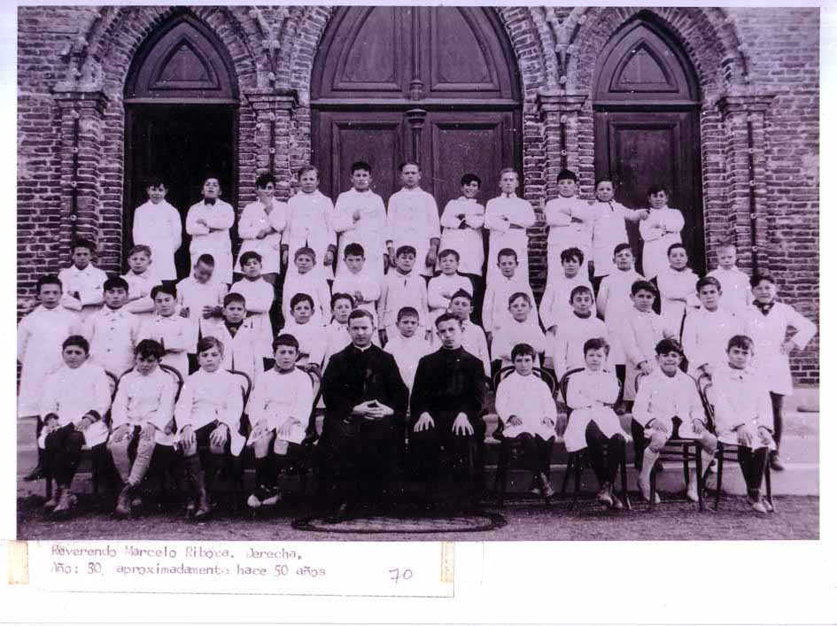 • Alumnos y dos sacerdotes, posando para la foto frente a la iglesia Santa Lucia de KM 3