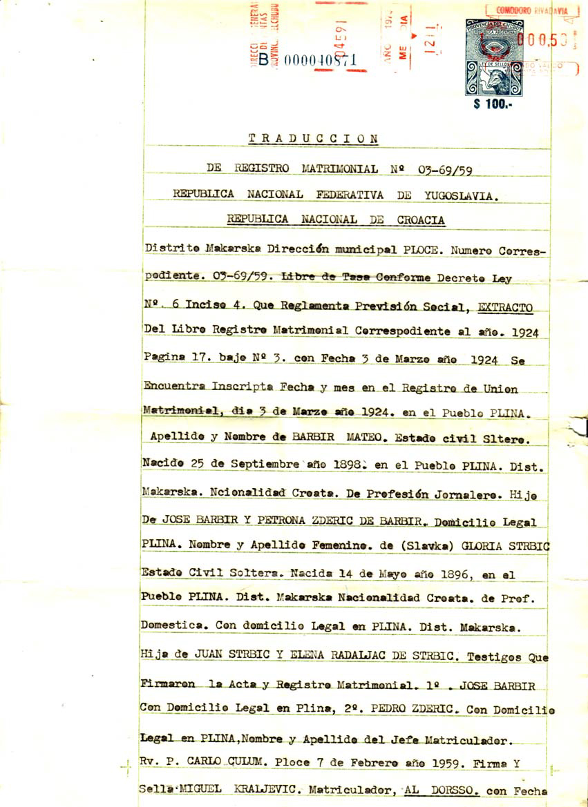 Translation of Yugoslav wedding certificate Image Information PAT00765 Documents, Family life Document 8.5x17 Barbir Spanish Spanish Image Information Traducción de certificado de casamiento de Yugoslavia Documentos, Vida familiar Post navigation Back of above PAT00763Back of above PAT00765 Comment on this post Cancel replyYour email address will not be published. Required fields are marked *What is your message?Name * Email * Save my name, email, and website in this browser for the next time I comment.