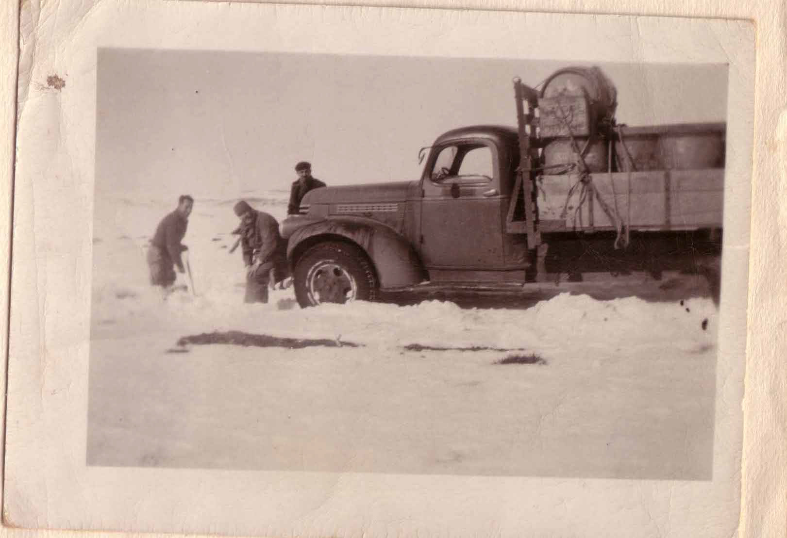 • Trucks transporting cargo between Comodoro Rivadavia and Río Mayo, ca. 1945. Men digging truck from snow. Gerónimo Conde is first on the left.