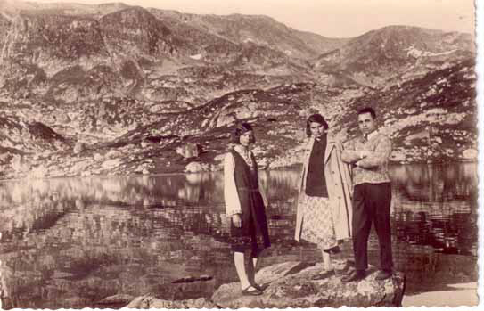two woman and a man on rock near lake