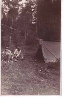Two men with tent in clearing