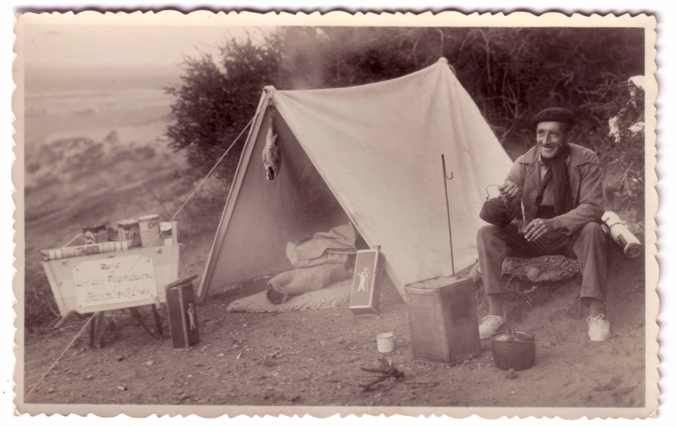The famous stubborn Basque and his wheelbarrow outside his tent